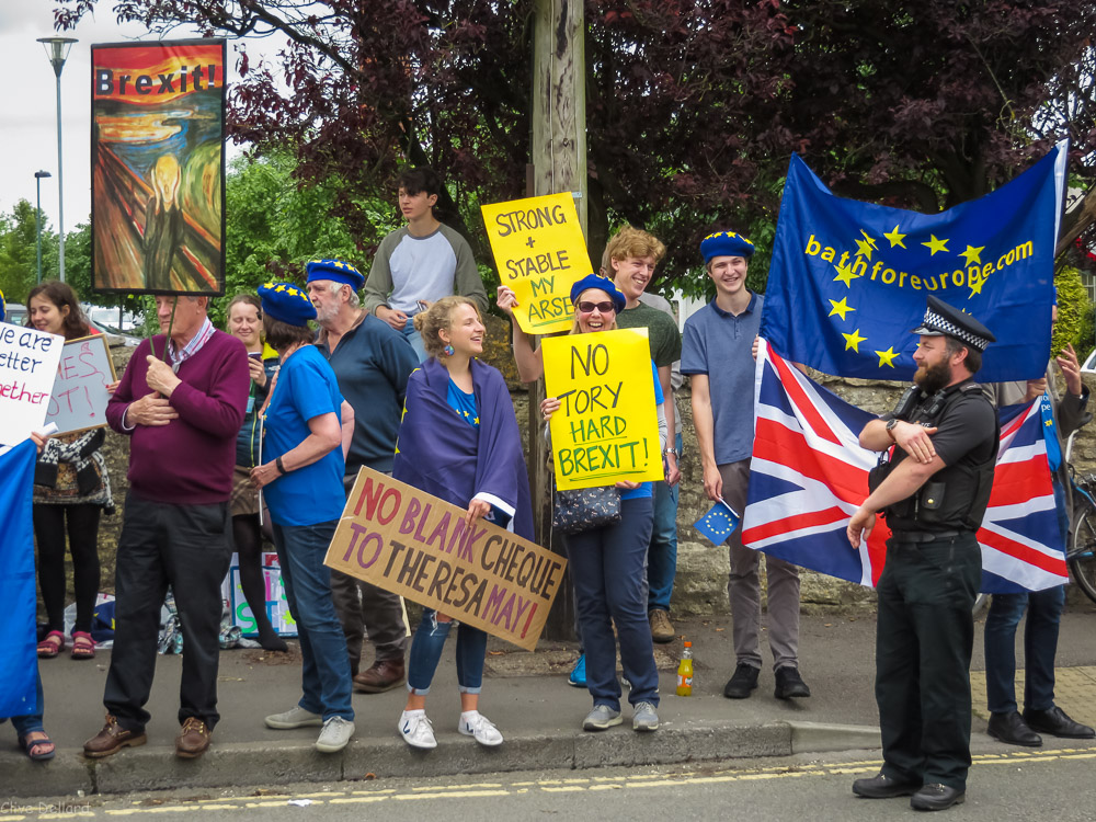 A colourful crowd of Bath for Europe supporters turned out alongside other opposition groups to send a strong message to Prime Minister Theresa May and the Tories this afternoon. Mrs. May visited the Cross Manufacturing site in Odd Down where she reportedly took questions from workers and was interviewed by the BBC’s Laura Kuenssberg. Armed with banners and posters and chanting slogans, the protesters attracted more to their numbers and had many positive honks from passing motorists. The Guardian and ITV interviewed Bath for Europe supporters.