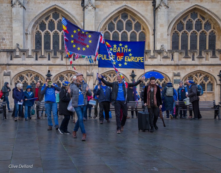 Rain and cold could not dampen the spirits of our marchers, with many familiar faces and a number of new ones, who brought colour and joyful noise to the centre of Baths. Many marchers wore their Bath Berets. They chanted and rang bells, stopping for short speeches and a violin serenade on Southgate and a symbolic torching of Brexit.