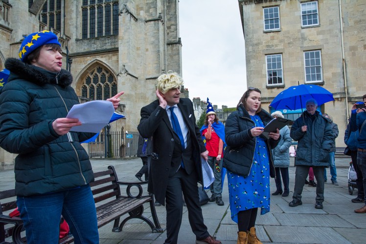 The Bath for Europe Players and Naomi Holdaway, student at the University of Bath and founder of Young European Voices, performed a comic street theatre piece featuring Boris Johnson who was handing out piles of free money.