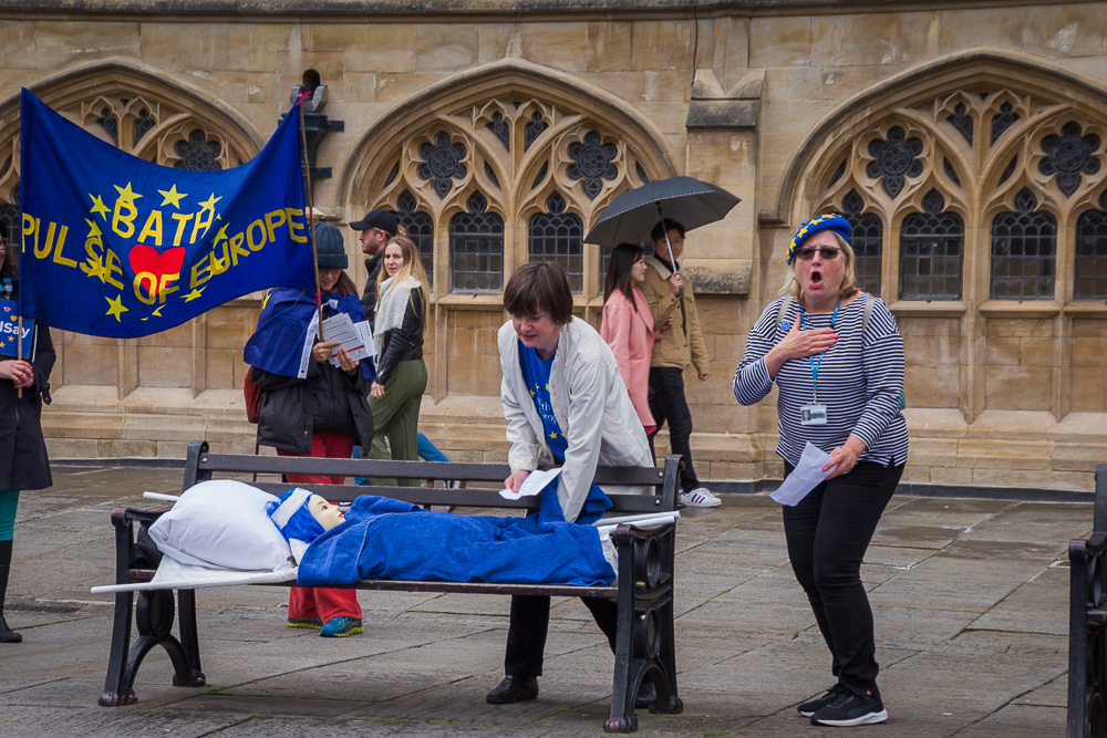 Pro-Remain campaigners from as far afield as Warwickshire joined our Pulse of Europe in Bath on Sunday, 8thApril. Speakers and street theatre highlighted the critical condition of our beloved NHS which is suffering from chronic underfunding and the threat posed by Brexit.
