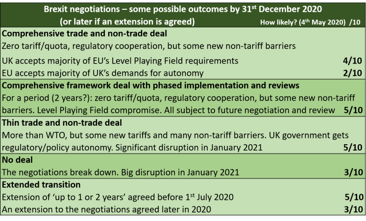 The government is nevertheless saying that the negotiations are continuing (some limited discussions are being conducted by video link) and insist that they will not seek an extension to the 31st December deadline. A statement on 16th April by David Frost, the UK’s lead negotiator, saying that the UK government will not ask for an extension was reaffirmed last week by Johnson and other senior ministers. Many commentators think this is crazy, but some accept it or seem resigned to it. Others think it’s likely that the government will ultimately back down and ask for an extension.